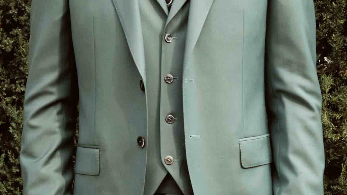 • Color: Zomp green suit with a white and blue check shirt and customized tie.