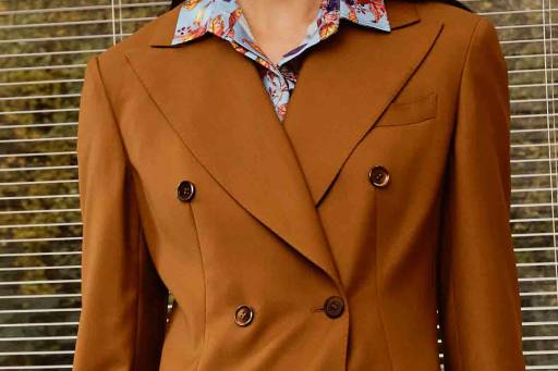 استمتعي بالأناقة والتفرد مع طقم البدلة ذات الصدر المزدوج باللون البني الذهبي، الذي يقترن بقميص مطبوع مخصص بشكل فريد. تم تصميم هذه المجموعة المتطورة للمرأة العصرية التي تقدر الأناقة والذوق الشخصي.